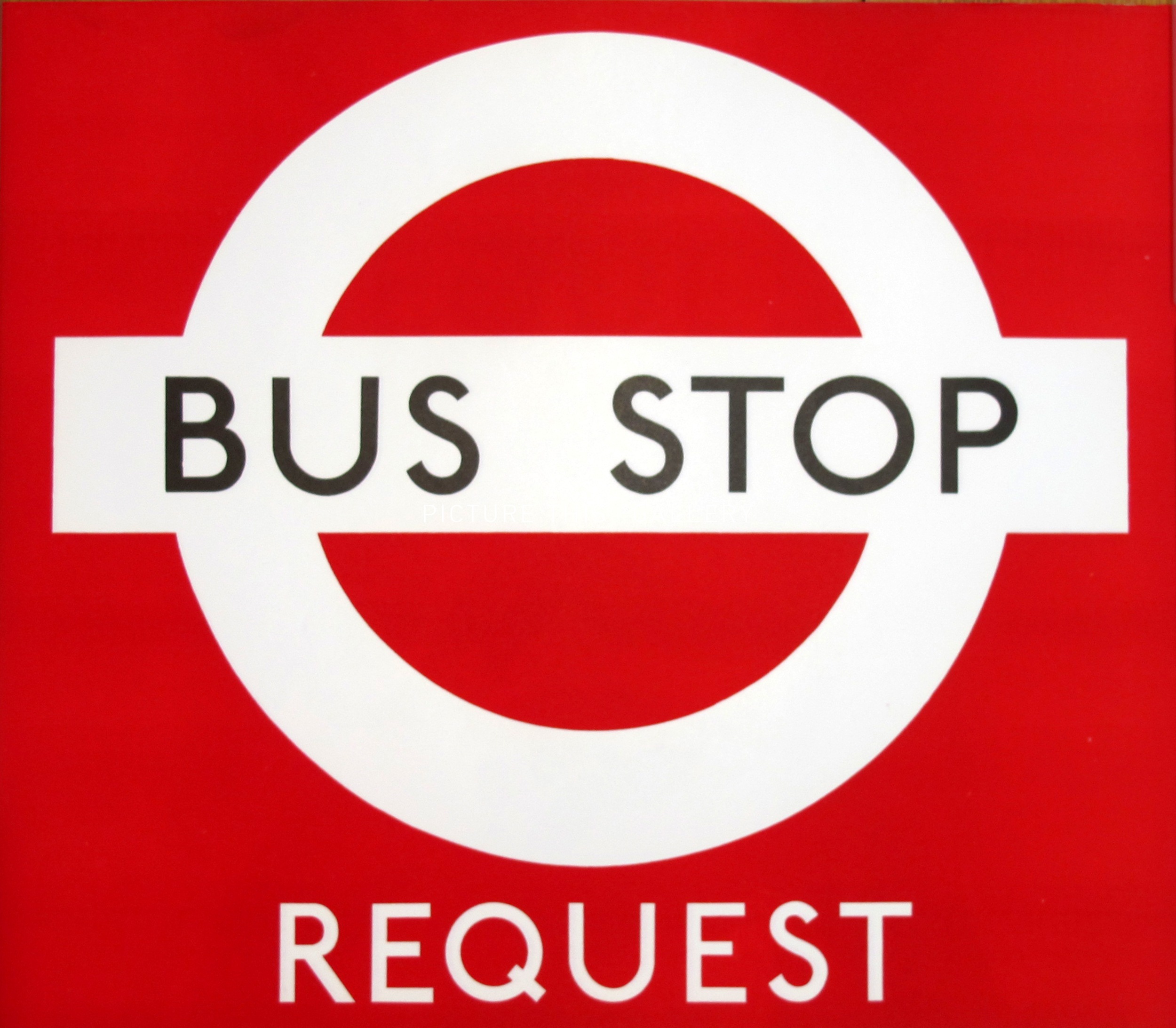 Vintage original red London bus stop signage produced in the 1950s. Small format, printed on paper.