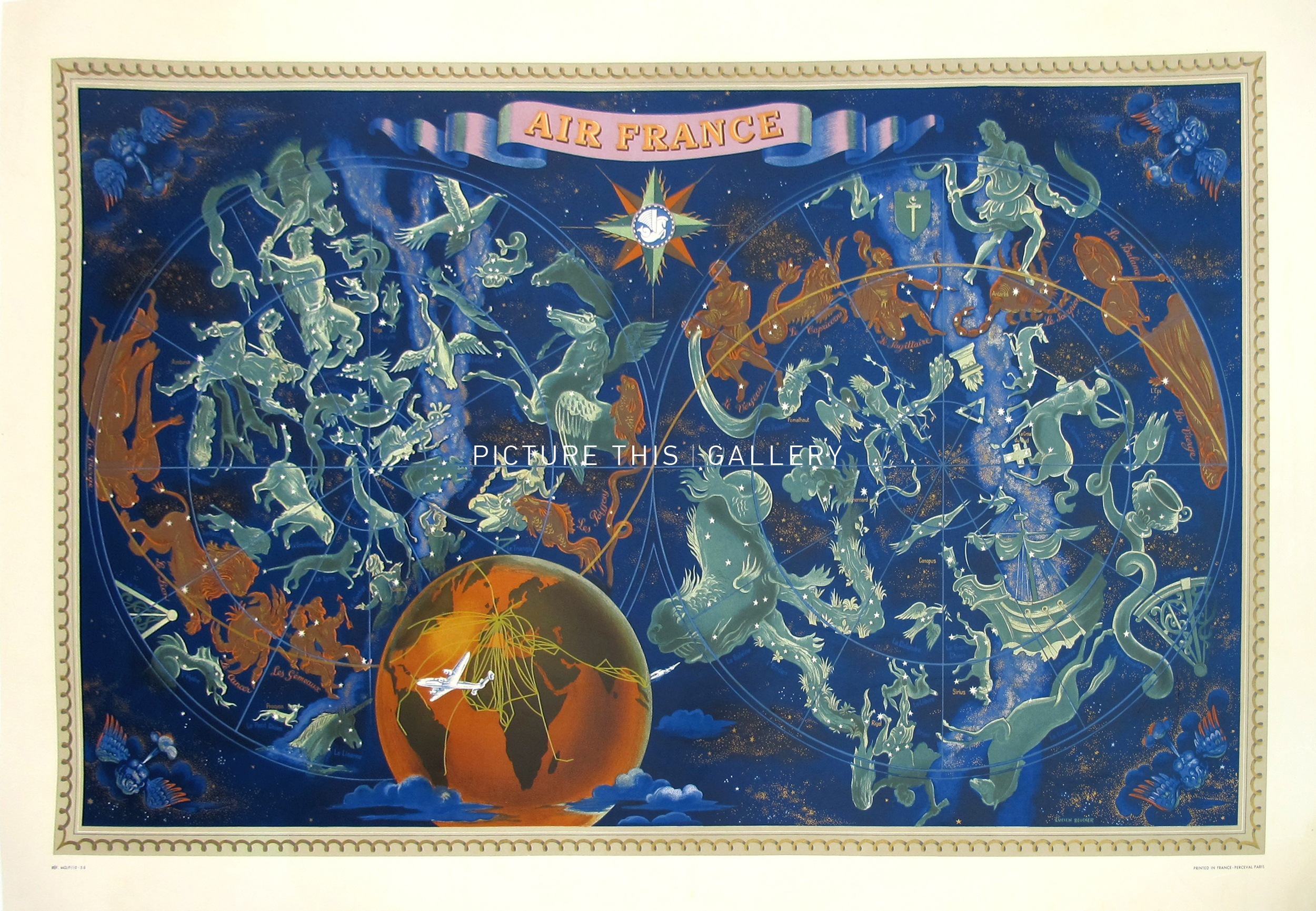 Vintage celestial map issued by Air France in 1956. Artwork by Lucien Boucher. Printed in Paris, France. Linenbacked.