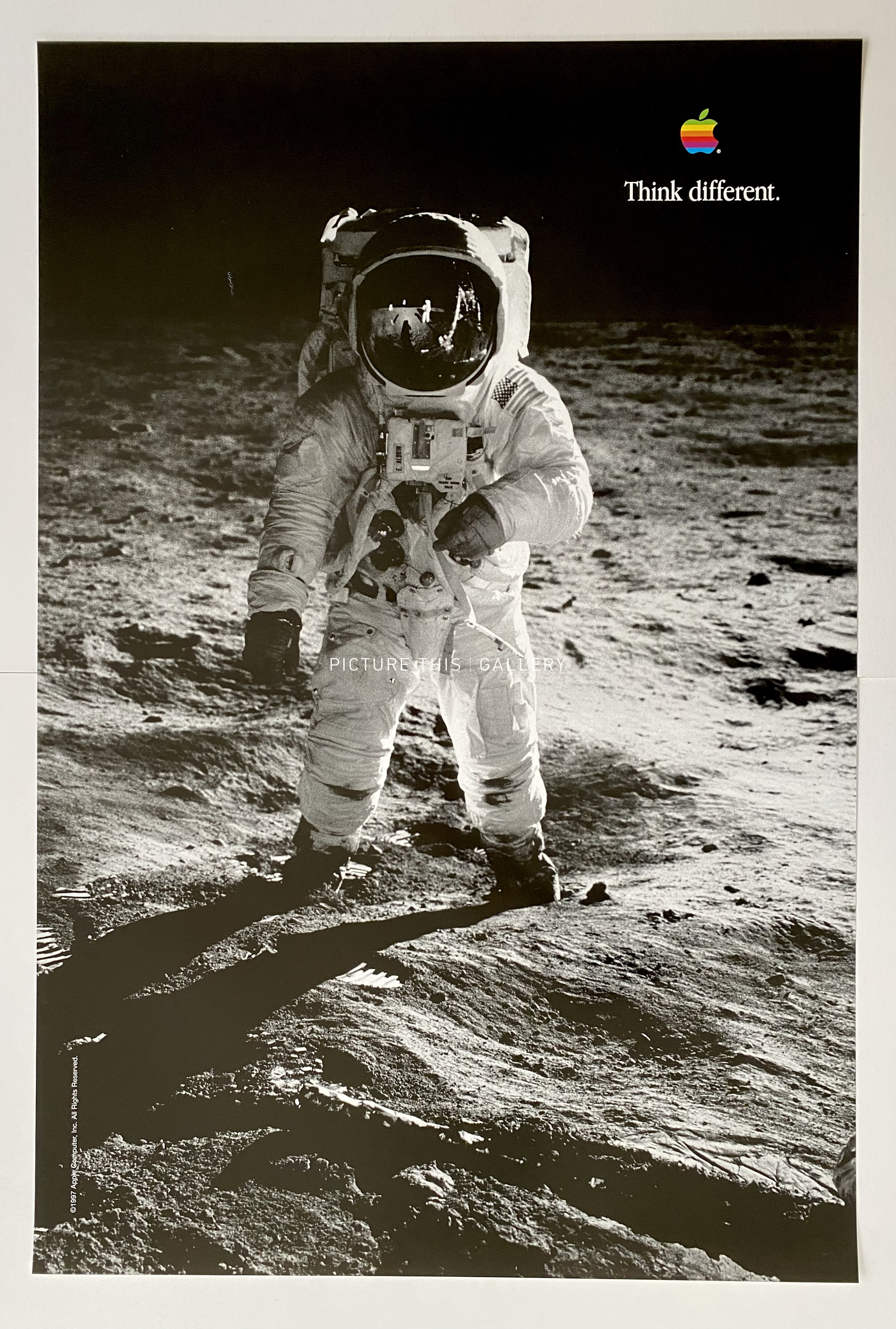 Original promotional poster issued by Apple Computer Inc. Features photograph of Buzz Aldrin on the lunar surface taken by the only other person present that day - Neil Armstrong. Printed in 1997.