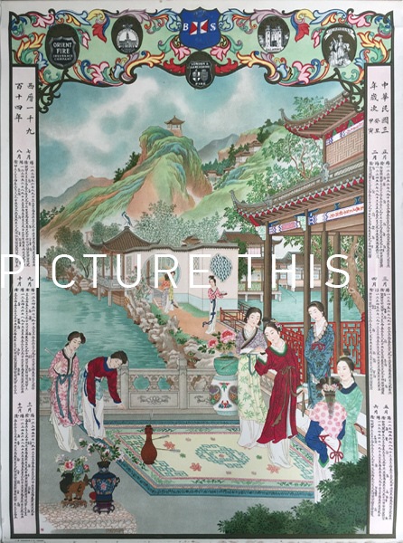 Original vintage calendar in the style of a poster issued by Butterfield & Swire with the company flag at top centre surrounded by logos of insurance companies for which B&S acted as agents, including Orient Fire, Royal Exchange Assurance, London & Lancashire and Guardian Assurance Company. The poster artwork is a representation of a traditional Chinese painting with ladies playing a game with arrows.
