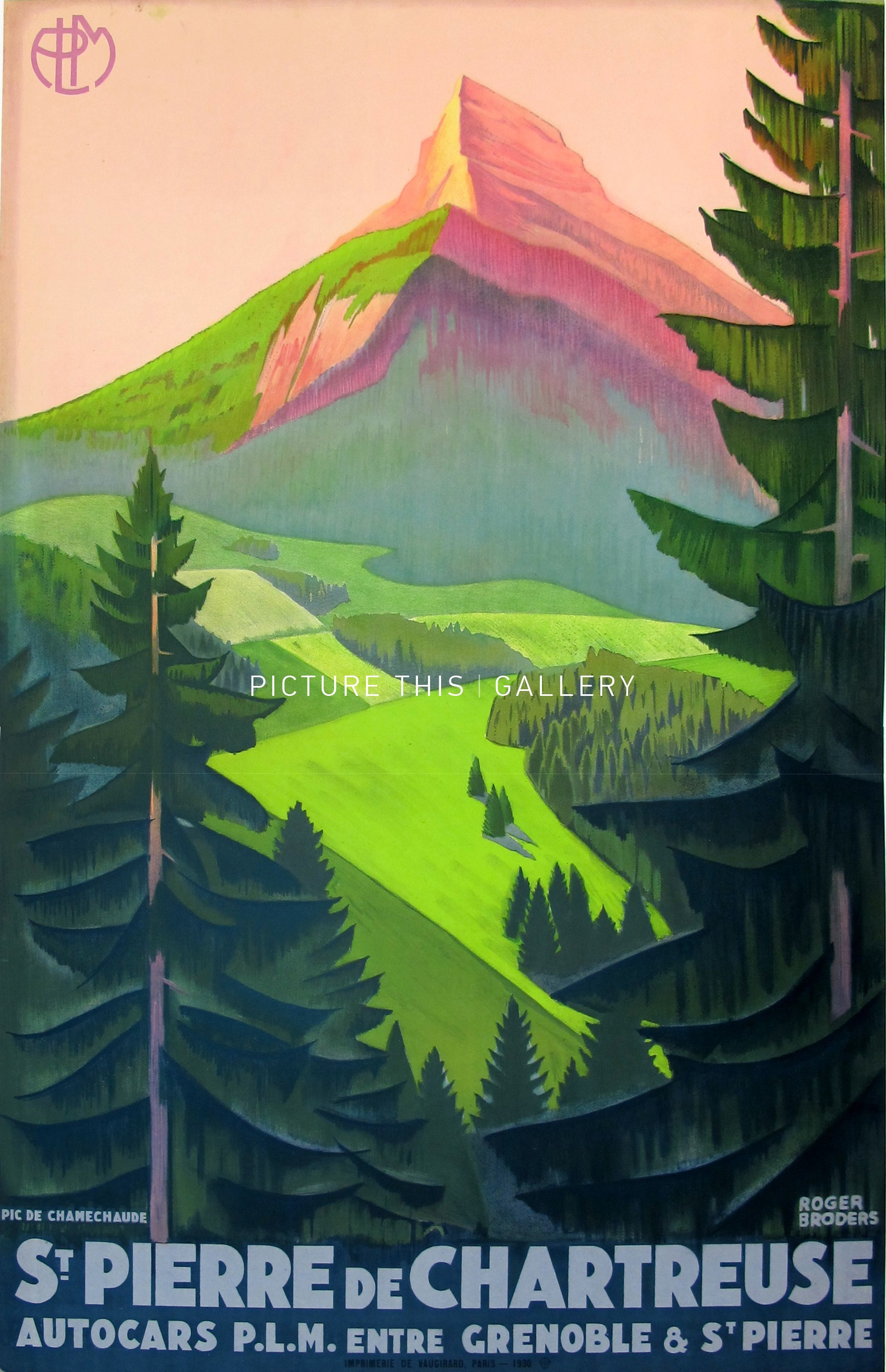 Vintage original railroad poster for the Paris-Lyon-Mediteranee railway company promoting French resort St Pierre de Chartreuse. Artwork by Rogers Broders. Printed in Paris, France, circa 1920’s. Linenbacked.